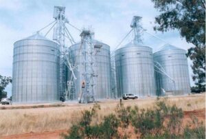 Two 1182 SilOz Grain Silos tonne Optimum 273mm unloading auger Three phase electric unloading and sweep 120t/hr Sweep auger with unique walking mechanism Heavy design